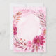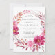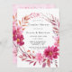 Design features a printed coloured with floral element in shades of hot pink and blush pink over foliage leaves branch wreath and chrysanthemum flowers on a light pink watercolor background.. Great for your wedding celebrations!