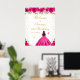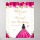 This elegant and glamourous birthday party welcome sign features a beautiful princess with dark hair and dark skin in a hot pink ball gown. The text combines handwritten script and modern sans serif fonts for a classy and sophisticated look. The floral arrangements, butterflies and gold confetti create the perfect blend of rustic and chic.