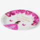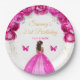 This elegant and glamourous birthday party plate features a beautiful princess with dark skin in a hot pink ball gown. The text combines handwritten script and modern sans serif fonts for a classy and sophisticated look. The floral arrangements, butterfly and gold confetti create the perfect blend of rustic and chic.