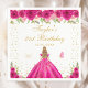 This elegant and glamourous birthday party napkin features a beautiful princess with blonde hair and fair skin in a hot pink ball gown. The text combines handwritten script and modern sans serif fonts for a classy and sophisticated look. The floral arrangements, butterflies and gold confetti create the perfect blend of rustic and chic.