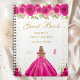 This elegant and glamourous sweet sixteen guest book features a beautiful princess with blonde hair and fair skin in a hot pink ball gown. The text combines handwritten script and modern sans serif fonts for a classy and sophisticated look. The floral arrangements, butterflies and gold confetti create the perfect blend of rustic and chic.