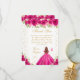 This elegant and glamourous sweet sixteen thank you card features a beautiful princess with brown red hair and fair skin in a hot pink ball gown. The text combines handwritten script and modern sans serif fonts for a classy and sophisticated look. The floral arrangements, butterflies and gold confetti create the perfect blend of rustic and chic.