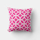 Hot Pink interlocking circles geometric pattern outdoor pillow. Made in the USA. UV and mildew resistant garden or patio pillows in with modern designs in bright summer colours. Available in 16 or 20 inch square and 13 by 21 rectangular sizes. Insert included. (Also available as an interior couch or sofa throw pillow, just select cotton or polyester from the Fabric tab).