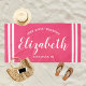 Personalised beach towel design for a girls' weekend vacation getaway features a custom first name in modern script writing framed by coastal stripes, with custom text for the occasion. The hot pink background colour can be modified. Please visit our shop for other colour options.