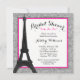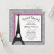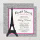 Glamourous Paris themed bridal shower invitations. Shown in hot pink and black. Featuring an Eiffel tower illustration with a faux silver glitter background. Designs are flat printed graphics - NOT ACTUAL GLITTER. Graphics by JW Illustrations