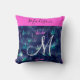 Girly and glam shimmery hot pink, purple, aqua turquoise, green and blue glitter sparkles crowns/ tiaras mermaid princess monogram name and initial throw pillow. Your custom name is written in black with a hot pink background, and your custom monogram is written in white with an elegant hand lettered script. A perfect birthday or Christmas gift!
