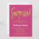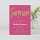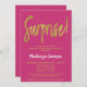 An elegant, modern hot pink and gold surprise birthday party invitation. Glam script text at the top and gold text below with the name in stand-out white