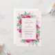 This design features a vibrant arrangement of fuchsia roses and peonies nestled among lush green foliage. A soft pink backdrop enhances the romantic watercolor aesthetic, perfect for a seasonal ceremony. Delicate leaves in emerald and sage create a balanced botanical border. The palette is bright and energetic.