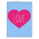 This greeting card features a shapely hot pink heart with the word "love" inside on a blue background. The card is blank inside for your customised text or handwritten sentiments.