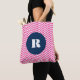 Modern and stylish monogram all over print tote bag featuring hot pink herringbone pattern with navy blue round tag. This will be perfect as a personalised gift. This design is available in a variety of colours and products.