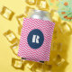 Modern and stylish monogram can cooler featuring hot pink herringbone pattern with navy blue round tag. This will be perfect as a personalised gift. This design is available in a variety of colours and products.