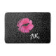 A trendy pink and black bathmat featuring a hot pink lipgloss kiss print against a black leopard print background. Personalise this girly design by adding your monogram initials.