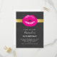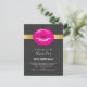 Birthday party invitation postcard with an illustration featuring hot pink lips. Bold and vibrant image. Set on a black mottled background.