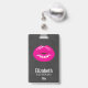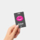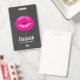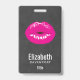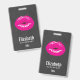 Personalised name badge with an illustration featuring hot pink lips. Bold and vibrant image. Set on a black mottled background.