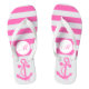Hot pink nautical themed flip flops. The designs features a pink anchor and a pink and white striped pattern. In the middle you can personalise with you monogram.