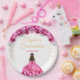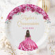 This elegant and glamourous Quinceañera birthday plate features a beautiful princess with dark hair in a hot pink ball gown. The text combines handwritten script and modern sans serif fonts for a classy and sophisticated look. The floral arrangements and gold confetti create the perfect blend of rustic and chic.