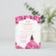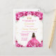 This elegant and glamourous Quinceañera birthday invitation features a beautiful princess with dark hair in a hot pink ball gown. The text combines handwritten script and modern sans serif fonts for a classy and sophisticated look. The floral arrangements and gold confetti create the perfect blend of rustic and chic.