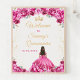 This elegant and glamourous Quinceañera welcome sign features a beautiful princess with dark hair in a hot pink ball gown. The text combines handwritten script and modern sans serif fonts for a classy and sophisticated look. The floral arrangements and gold confetti create the perfect blend of rustic and chic.