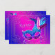Beautiful royal blue hot pink masquerade party RSVP with pretty teal blue purple hot pink and royal blue feather mask on a gorgeous purple and hot pink background. This elegant hot pink purple masquerade party RSVP is easily customised for your event by simply adding your event details, font style, font size & colour, and wording. This is a printed design with no real glitter, feathers, jewels, etc.
