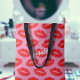 A flirty tote bag with a bright red lipstick kiss pattern on a pink background. Add your name or keep the kisses text (keep the kisses! - always keep the kisses)