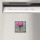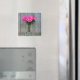 A magnet featuring a photo of a hot pink rose bouquet in a vase sitting on the ground in front of a barn.