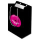 A gift bag with a drawing of a pair of shiny pink feminine lips on a black background.