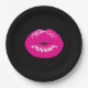 Paper plates with a drawing of a pair of shiny pink feminine lips on a black background.