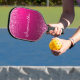 Cute and girly pickleball paddle with your name printed in an elegant script font onto a hot pink and silver glitter background.