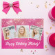 Pretty pink sparkles decorate this cute custom photo collage birthday card for a woman, teenager, or little girl who loves sparkly glam gifts. Personalised happy birthday gift with 3 photographs over a hot pink girly background.