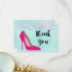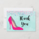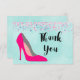A thank you card with a hot pink stiletto shoe. Pink confetti sprinkled along the top. Set on a mint green watercolor background. Chic and glamourous.