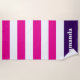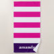 Hot Pink White Stripes Custom Name Beach Towel, Make a splash with this chic beach towel with bold hot pink and white stripes, modern typography, and one stripe in deep purple. Add your name, monogram, or initials to the towel and you're all set for your next beach outing. There's a matching duffle bag available if you want a complete look.