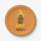 Cute brown potato with sticks for arms and a big happy fave surrounded by flames. Below in yellow and orange letters is the word hot, and below that in brown letters is the word potato.