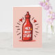 This cute card features a hot sauce bottle in bold red on a soft pink background. Simple shading gives the bottle a slightly 3D look. On the label, large white letters read “HEY HOT STUFF,” with a small flame underneath.