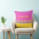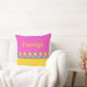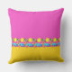 This stylised pattern on a square throw cushion has a frieze along the bottom celebrating beach life, with sunshine, palm trees, blue sea and golden sand. The design is complemented by bright pink and sunshine yellow colour blocks. One side can be personalised with your name. The artwork is an original, unique, hand drawn stylised drawing, digitally coloured.