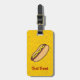 Cartoon illustration of hotdog. Junk food outline icons yellow pattern background. Custom text on both sides.