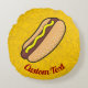 Cartoon illustration of hotdog. Junk food outline icons yellow pattern background. Custom text on both sides.