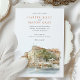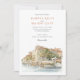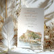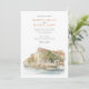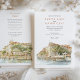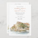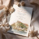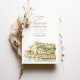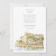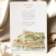 Invite your guests to an unforgettable Italian celebration with this exquisite watercolor wedding invitation, showcasing the legendary Hotel Cipriani, a Belmond Hotel, in Venice, Italy. The artwork beautifully captures the iconic Venetian architecture of the hotel, with its warm creamy yellow and ochre walls, classic terracotta tiled roofs, and charming balconies overlooking the serene canal. Distinctive red/orange and white striped mooring poles (paline) line the waterfront, a quintessential Venetian detail. The hotel's renowned terrace is depicted bursting with vibrant flowers – an abundance of lush pinks (ranging from soft to vibrant), delicate whites, and perhaps hints of creamy yellow, likely featuring classic garden blooms such as roses, geraniums, or bougainvillea, all nestled amongst rich green foliage. Lush green trees, possibly including olive trees, add to the Mediterranean charm. Rendered in a soft, romantic watercolor style that evokes the unique light and atmosphere of Venice, this invitation is perfect for a luxurious destination wedding or for couples enchanted by the timeless romance of Italy. The reverse side offers "The Finer Details" for guest information, continuing the beautiful Venetian artwork. The colour palette includes creamy yellows, ochres, terracotta reds, vibrant pinks, soft whites, various shades of verdant green, and the gentle blues of the water.