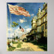 The "Hotel des Roches Noires" painting captures a tranquil scene along the picturesque Normandy coastline, specifically in the seaside town of Trouville-sur-Mer. The scene portrays the iconic Hotel des Roches Noires nestled amidst the cliffs and sandy beaches. The painting exudes a sense of serenity and leisure, with figures leisurely strolling along the shore and enjoying the sea air. The vibrant colours and dynamic brushwork convey the play of light and shadow on the water and the surrounding landscape, creating a captivating sense of movement and atmosphere. With his masterful technique, the artist invites viewers to immerse themselves in the timeless beauty of this quintessential seaside retreat.