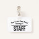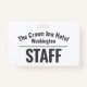 Hotel Staff Named Identity badge. Simple design showing hotel name and location plus the word "STAFF" big and bold on the back. Staff uniform identity badge for hotel employees. Carry your brand identity across hotel workers' clothing. Also perfect for pubs and bar workers. Hotel name is curved.