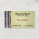 A very elegant and stylish business card. A stripe of black and white houndstooth on the left side against a softly graded cream background. A red satin ribbon ties sit all together.
