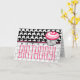 A birthday card featuring a background of black and white houndstooth. Sheer bottom half features pink trim. Black and pink text reads "Happy Birthday!" Illustration of pink cupcake at right. Inside features sheer houndstooth background. Look for matching items in the "Birthday Shop" category of The Pink Schoolhouse store.
