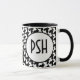 A mug featuring a solid black houndstooth design. Features a circle shaped frame wit monogram inside.