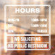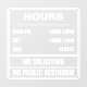 Window sign for store hours of operation. Personalise it with your shop's personal business hours. Extra no soliciting and no public restroom text that can be customised to suit your needs. Display it on the front window or door of your location.