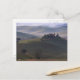 Postcard of a farmhouse in the morning fog at the break of dawn in Tuscany between the rolling hills of the Val d’Orcia valley between Pienza and San Quirico d’Orcia in Italy.