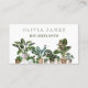 A horticultural business card, suitable for a plant nursery or small business. On a white background, the botanical design consists of watercolor images of nine plants including a ficus, peperomia, aloe vera, calathea, pothos and bird of paradise. Personalize by adding your business and contact details to the front and back.