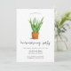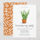 Cute and modern housewarming party invitation featuring illustration of a snake plant. The back of the card has a pattern on an orange background.