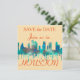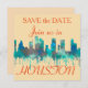 Invitations featuring a blue stained glass type image of a Houston skyline