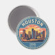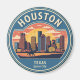 The image captures the essence of Houston's skyline in springtime, with the vibrant hues of blooming trees contrasting beautifully against the towering skyscrapers. The vintage travel poster style adds a nostalgic touch, evoking memories of a bygone era of travel and adventure.