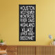 This is a list of some of the most recognised places in the city of Houston , Texas in Typography of a modern white on classic black background. Westheimer is where the Hotels and large retail stores are, Montrose is the Artist District, River Oaks is where the rich and famous live, Highland Village is for upscale shopping stores and boutiques, Upper Kirby is the elite street and Bissonnet is the Museum District.