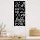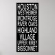 This poster is a list of some of the most recognised places in the city of Houston , Texas in Typography of a modern white on classic black background. Westheimer is where the Hotels and large retail stores are, Montrose is the Artist District, River Oaks is where the rich and famous live, Highland Village is for upscale shopping stores and boutiques, Upper Kirby is the elite street and Bissonnet is the Museum District.
